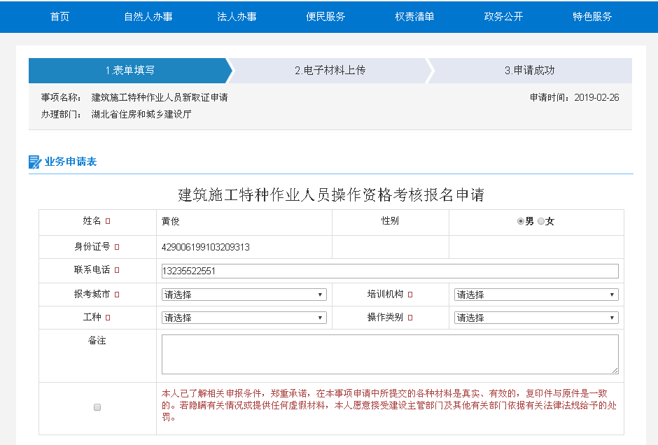关于建筑施工特种作业人员新取证报名通知各县(市、区)建筑业、各施工企业: 根据《关于办理咸宁职业技术学院建筑施工特种作业人员考核基地相关手续的请示》的批复,湖北省建设工程质量安全监督总站同意在咸宁进行建筑施工特种作业人员考核。为落实湖北省建设工程质量安全监督总站的相关要求,现将2019年建筑施工特种作业人员考核相关事项通知如下: 一、考核对象 各施工企业和建筑业新取证人员 二、考核工种 1、建筑电工 2、建筑架子工 3、建筑起重信号司索工 4、建筑起重机械司机(塔式起重机) 5、建筑起重机械司机(施工升降机) 6、建筑起重机械司机(物料提升机) 三、报名条件 1、年满18周岁、60岁以下,且符合相关工种规定的年龄要求; 2、经医院体检合格且无妨碍从事相应特种作业的疾病和生理缺陷; 3、初中及以上学历; 4、符合相应特种作业需要的其他条件。 四、报名方式及相关资料 采取网上报名方式,登陆湖北政务服务网(http://zwfw.hubei.gov.cn/)进行报名(操作流程见附件1、湖北政务服务网特种新取证报名操作说明)。 相关资料有: 1、特种作业人员新办汇总表 2、湖北省特种作业考核诚信承诺书 3、湖北省建筑施工企业种作业人员培训协议书 4、体检表(正规医院体检证明) 5、学历证明(初中以上,或是户口本复印件) 6、身份证复印件及一寸蓝底照片两张 网上报名成功后,将以上纸质资料交到咸宁职业技术学院继续教育学院(职苑宾馆大厅靠右第三间办公室) 五、考试方式 考生先到学校本部参加培训和理论考试,再到考核基地进行实操考核,考试必须持本人身份证原件到现场参加理论考试,现场所拍摄照片为学员上报系统办证照片,并签到。 六、报名时间及收费标准 1、2019年7月5日——2019年7月22日 2、培训费650元/人 七、联系电话: 郑老师:0715-8123788 QQ155378706 李老师:0715-8251555 QQ 33411243 八、附件: 1、湖北政务服务网特种新取证报名操作说明 2.建筑施工特种作业人员汇总表 3、湖北省特种作业考核诚信承诺书 4、湖北省建筑施工企业种作业人员培训协议书 咸宁职业技术学院继续教育学院 2019年7月5日 附件1:湖北政务服务网特种新取证报名操作说明 http://zwfw.hubei.gov.cn/special/modefy.jspx 一、注册/登录 第一步:点击页面右上角注册,选择“自然人”注册。填写基本信息,验证手机号码。** 一个手机号码只能注册一人。**