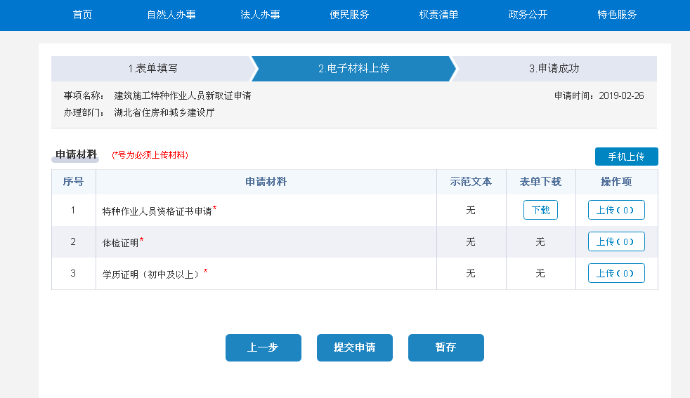 按要求上传以下三个JPG文件(申请如下模板,体检证明应为正规医院原件,学历为初中以上扫描件或户口本当事人页扫描件)